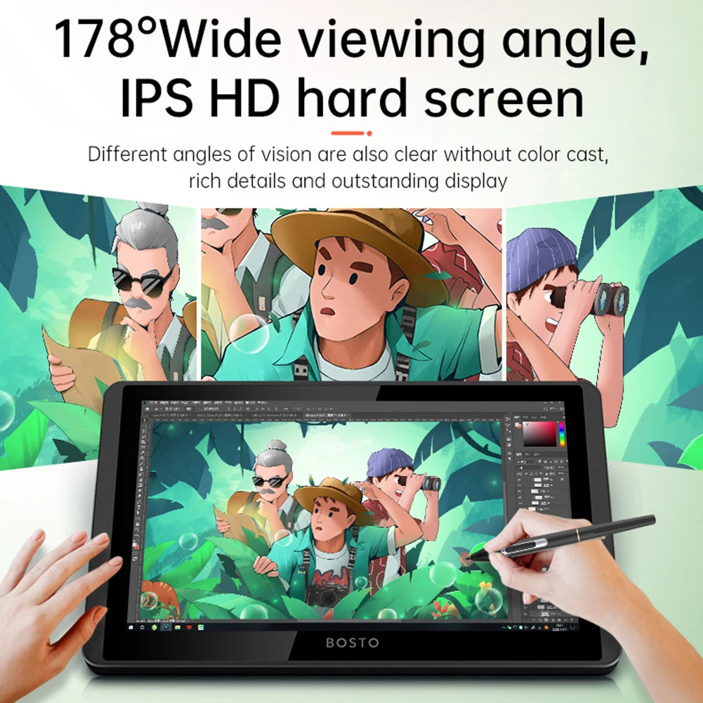Features: 1. 11.6-inch IPS HD Screen with Vibrant Colors of Drawing Tablet Monitor: Enjoy a large and clear display with a resolution of 1366 * 768, 16.7 million rich color depth, 1000:1 contrast ratio, 250cd/㎡ brightness, and 178° viewing angle. 2. Battery-free Pen: The ergonomic design reduces fatigue from long-term use. The pen has 2 customizable buttons for convenient drawing. The magnetic side of the digital art tablet allows you to attach the pen, so you won't forget it while carrying. 3. 8192 Pressure Levels for Precise Drawing: With 8192 pressure levels and a fast response time of 25ms, the digital art drawing pad provides a smooth and natural drawing experience. It also supports touch input for easy finger operation. Comes with a 2-in-1 USB cable with 4 different interfaces. Compatible with Windows 7 and above, compatible with Mac OS 10.11 and above. Can be connected to PCs/laptops. 4. Full Lamination HD Screen for Easy Use: The drawing tablet with screen features a gapless steel glass design, improving pressure sensitivity control accuracy and reducing visual deviation. The foldable all-metal stand allows you to tilt the tablet up to 19° for a comfortable position. 5. Wide Application Compatibility: Drawing tablet with screen is perfectly compatible with art software such as Photoshop, SAI, Clipstudio, Sketchbook, Artrage, CAD, Adobe Illustrator, Painter, Flash, and C4D. Ideal for digital illustration, design, animation, digital signatures, online education, and more. Includes 8 pen nibs, nib remover, cleaning cloth, glove, tablet protective case, 2-in-1 USB cable, battery-free pen, and quick guide. Specification: 1 x Writing Tablet
