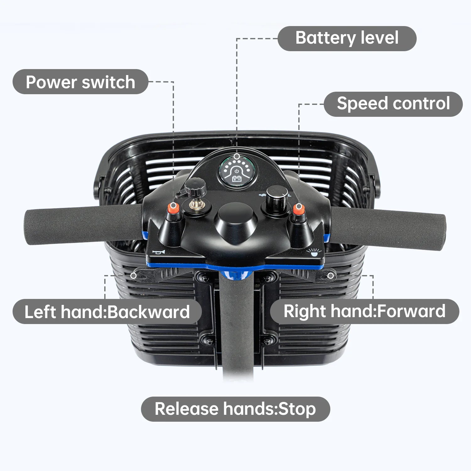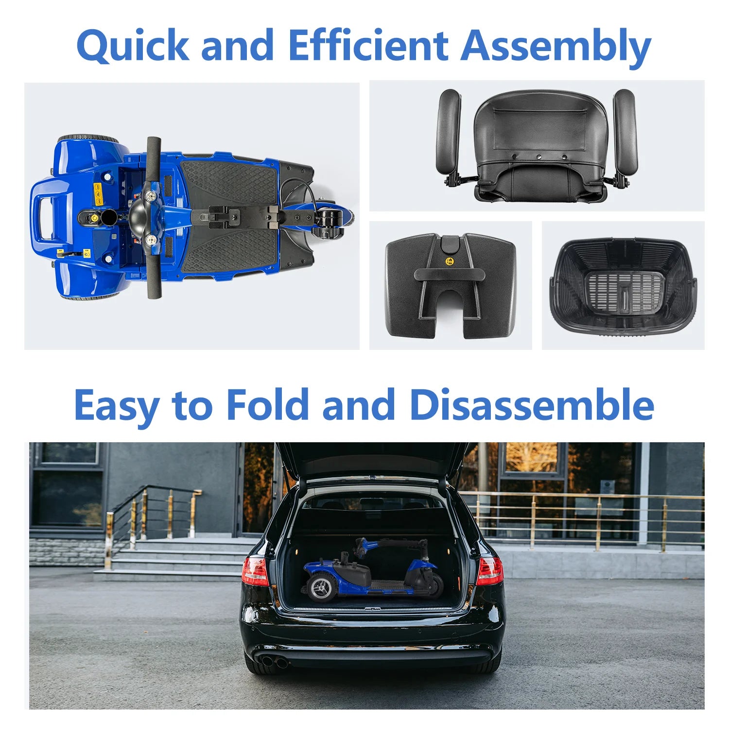 Easy disassembly and installation: This mobility scooter can be divided into 4 parts: body, battery, seat, and storage basket. You can assemble and disassemble it very easily, and after disassembly, the volume is smaller and easier to transport, and it can be put into a standard-size car very easily.