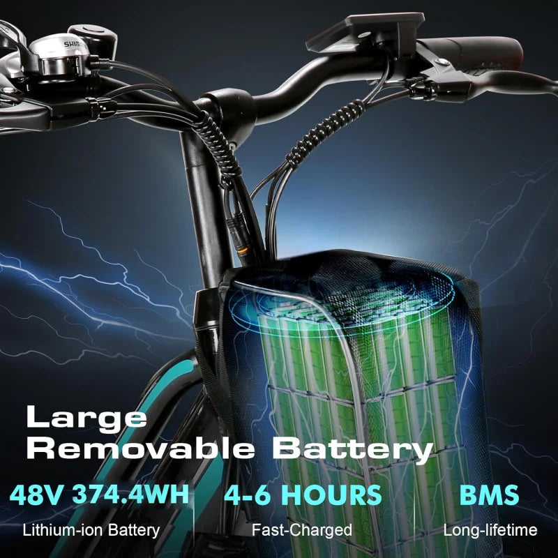 **【REMOVABLE LITHIUM BATTERY】** The cruiser electric bike is equipped with a 48V 374.4WH removable lithium battery, providing a range of 22-25 miles in all-electric mode and 44-50 miles in pedal-assisted mode. It's enough for a day's round trip and commuting. The electric bike has passed UL 2849 certification.