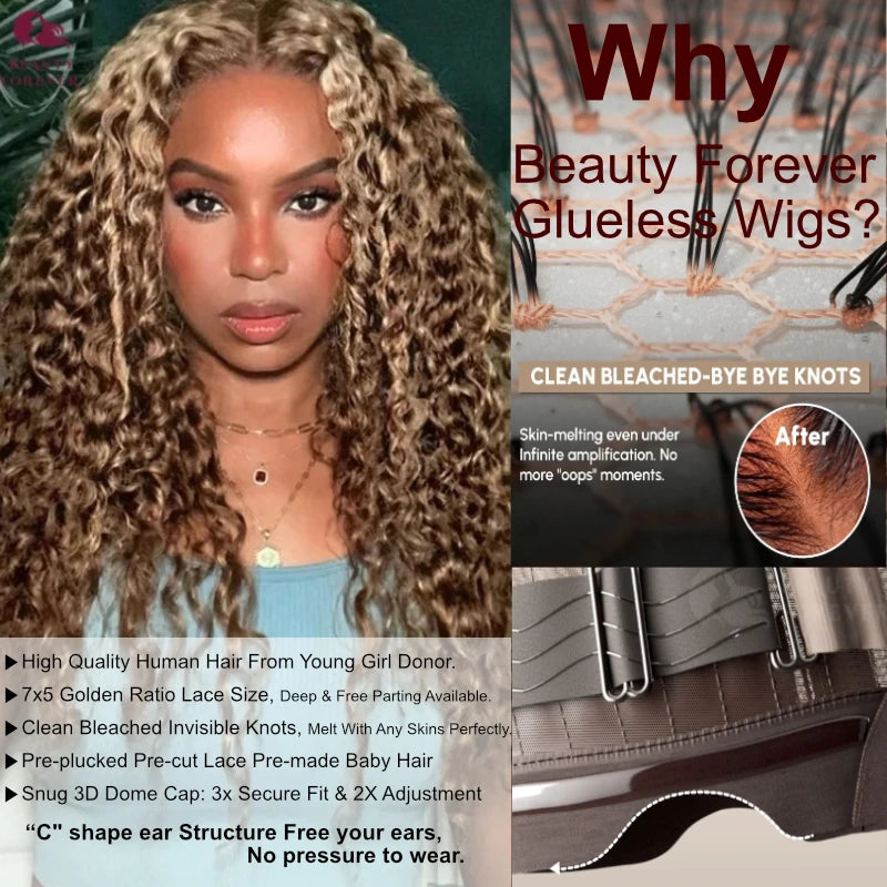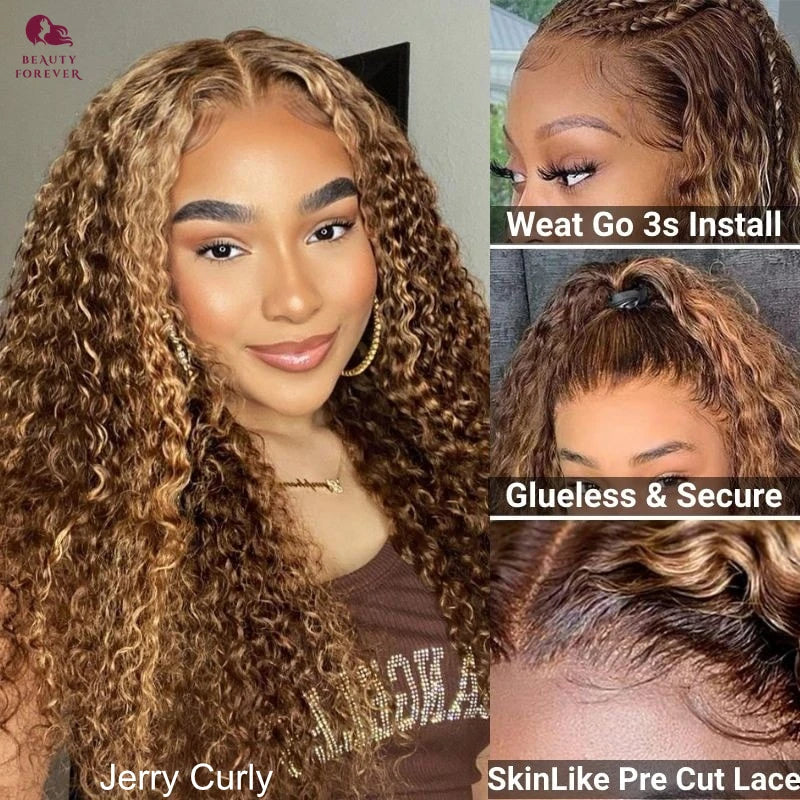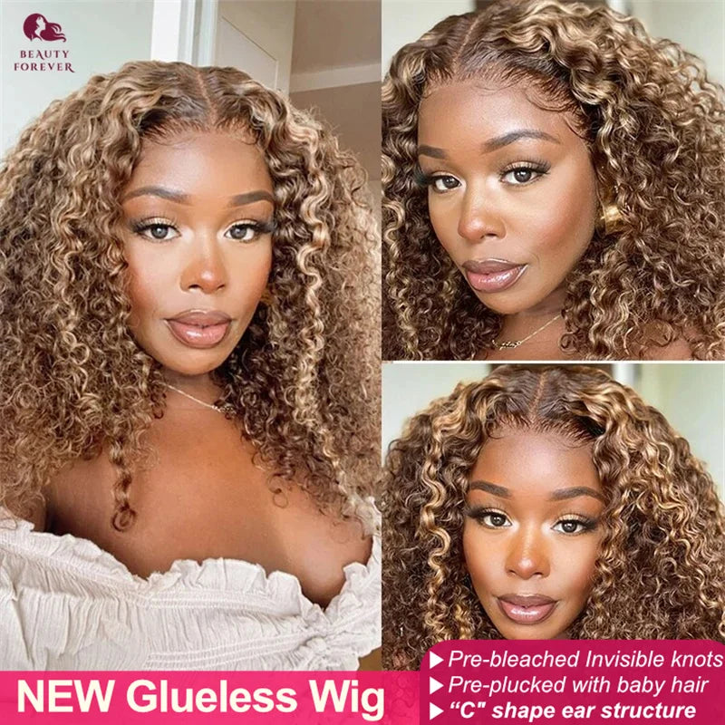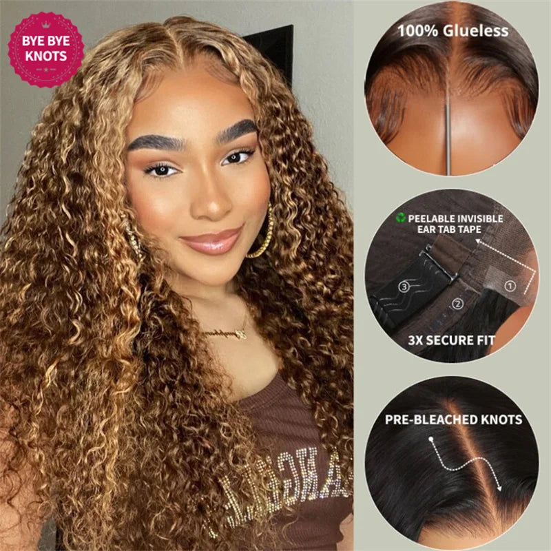 Bye Bye Knots Highlight Brown Glueless Preplucked Human Hair Wig Curly Ready To Wear Invisible Knots Transparent Lace Front Wig Density 180%