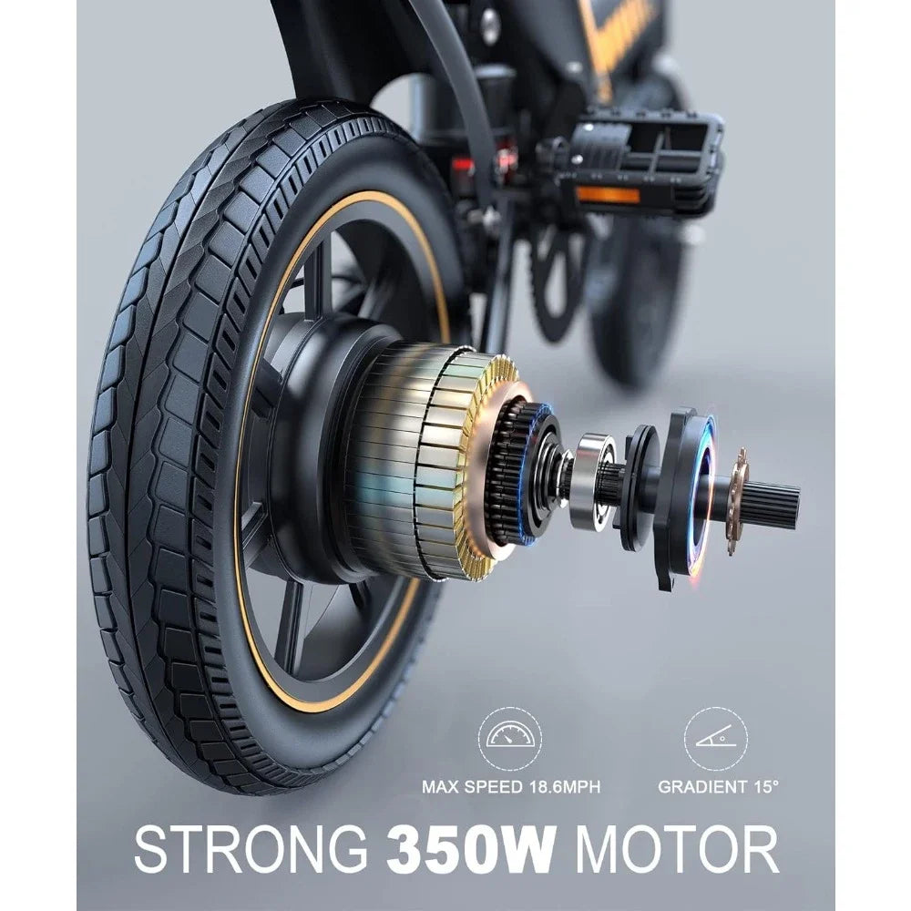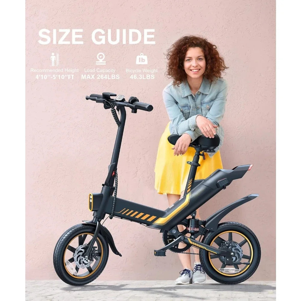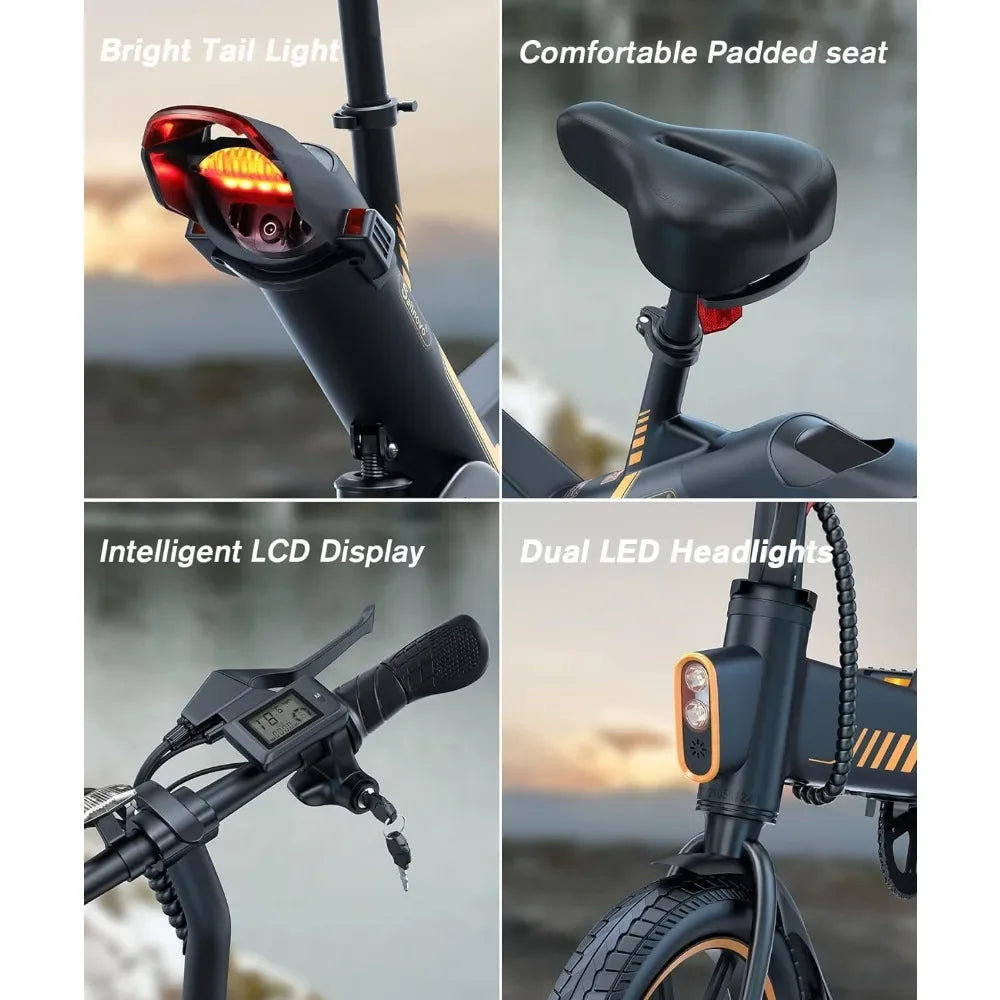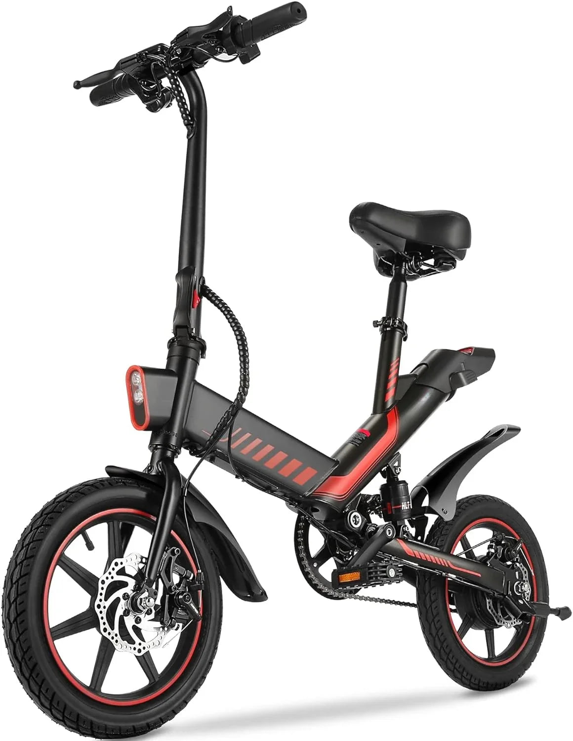 - INDIVIDUALIZED DESIGN: With a color block looking, sports style, streamlined matte surface, this portable mini city bike is equipped with dual disc brakes, non-slip bump handlebars, LCD battery/speed Indicator, foldable handlehead, adjustable saddle(30.7"-34.6"), 14" anti-shock tires, front lamp and tail lights.