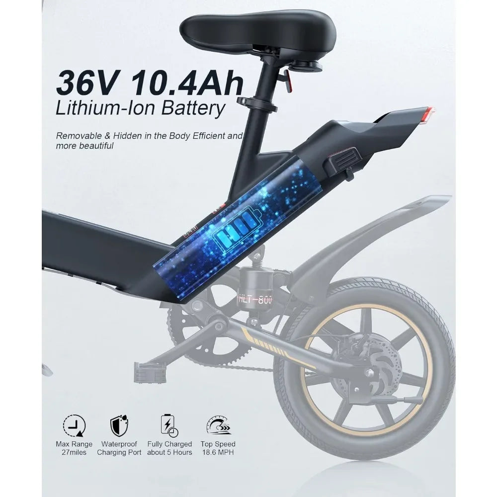 - PARAMETERS: 350W(Peak 500W) Powerful electric bikes with a 36V 374.4WH built-in rechargeable Lithium-Ion battery (5-6h charging time) and up to 18.5mph speed, providing enough power for everyday commuting, outdoor exercise, weekend fun and vacation camp.