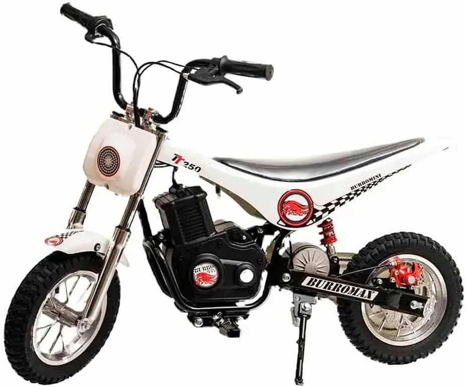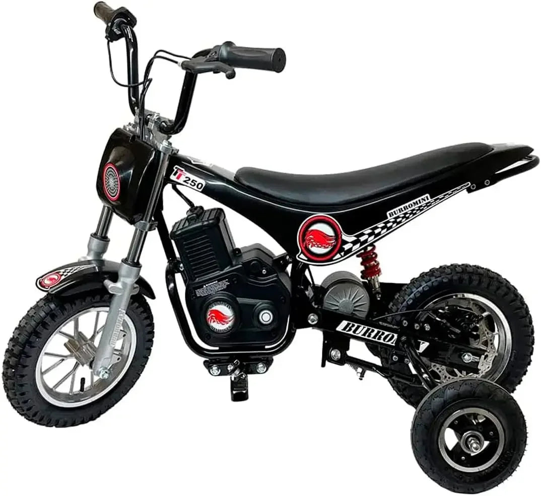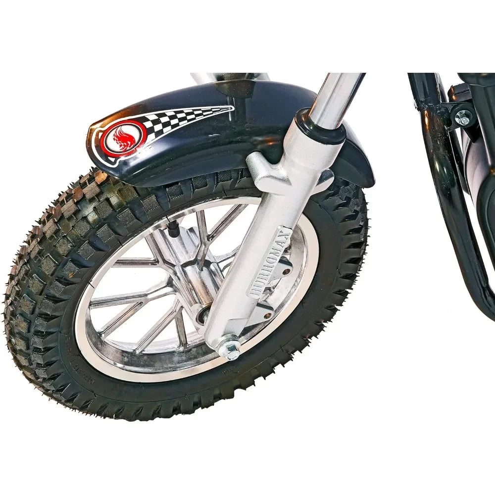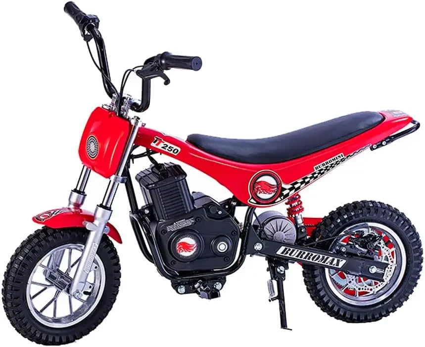 Every Inch of this bike says motorcycle! We have created the coolest and best quality piece out there. We've scaled down a cross between a TT Enduro and a Flat Tracker to give you a distinct look, added large diameter aluminum alloy wheels with 12.5" diameter pneumatic tires, rear disc brakes and a taller and wider 21" seat height for rider comfort with adjustable wide handlebars for added control. Heavy duty welded steel tube frame with adjustable mono shock rear suspension and telescopic front forks make this bike a very smooth ride. A realistic looking engine houses the power source and really helps set this bike apart from the competition. Our 250W motor with a 24V SLA deep cycle battery power system includes a charge indicator mounted on the motorcycle style twist grip throttle control. Select the top speed for riders skill level at 7 mph or 14 mph, has a 12 mile range with a 100 lb rider. The bike can be recharged in 8 hrs and comes with a charger.