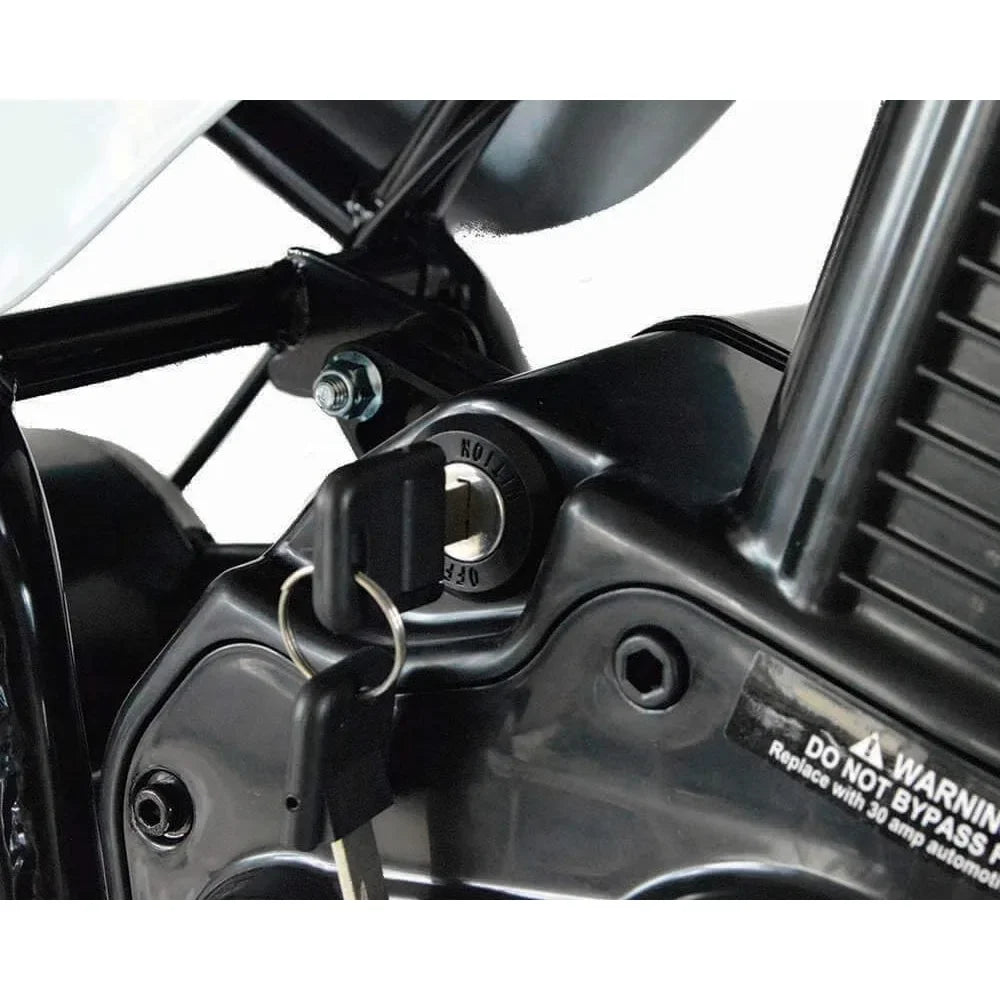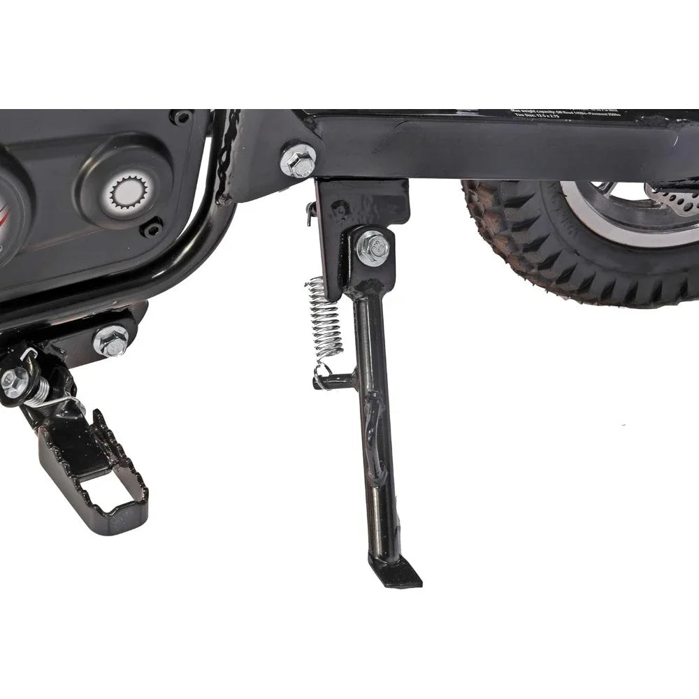 | Specs | Impressive suspension for a great ride. Handy grab rail. Telescopic front fork Suspension. Twist Grip variable acceleration control. Heavy duty retractable kickstand. Heavy Duty folding footrest. Tools Included. |