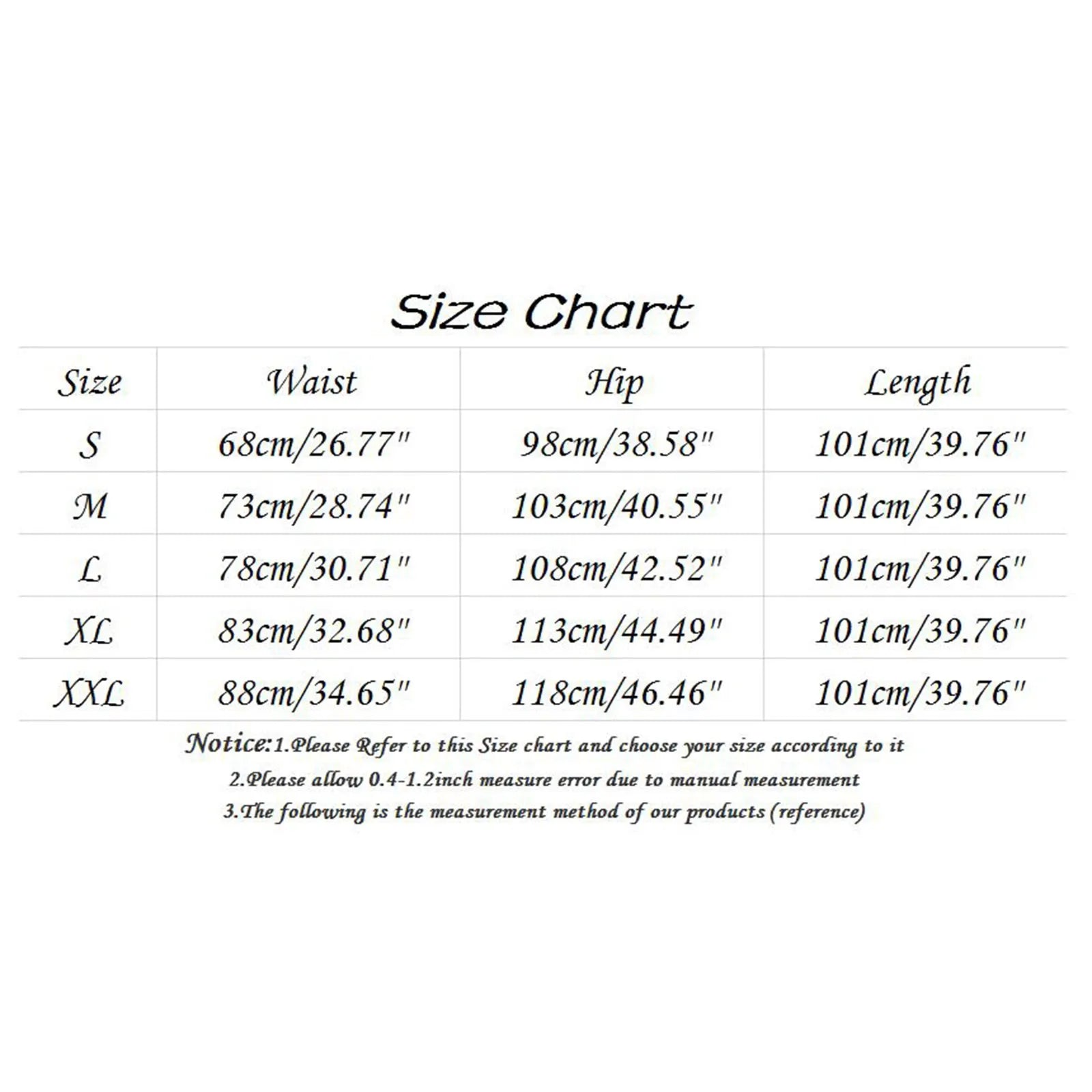 | Size:S | Waist:68cm/26.77'' | Hip:98cm/38.58'' | Length:101cm/39.76'' |