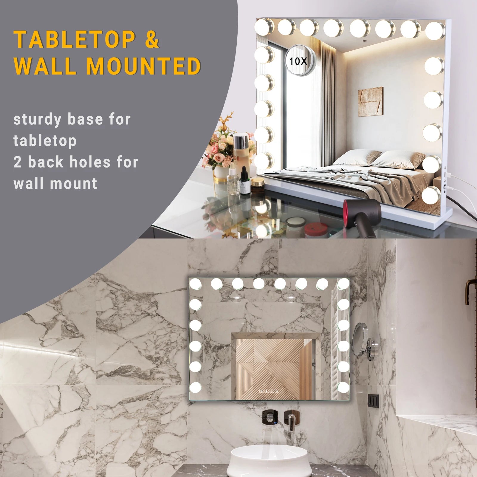 Our professional makeup vanity mirror with lights comes with a stable base. The large vanity light up mirror also has 2 back holes for wall mounting in bedroom and bathroom. Conveniently put it in your dressing table or hanging it on the wall