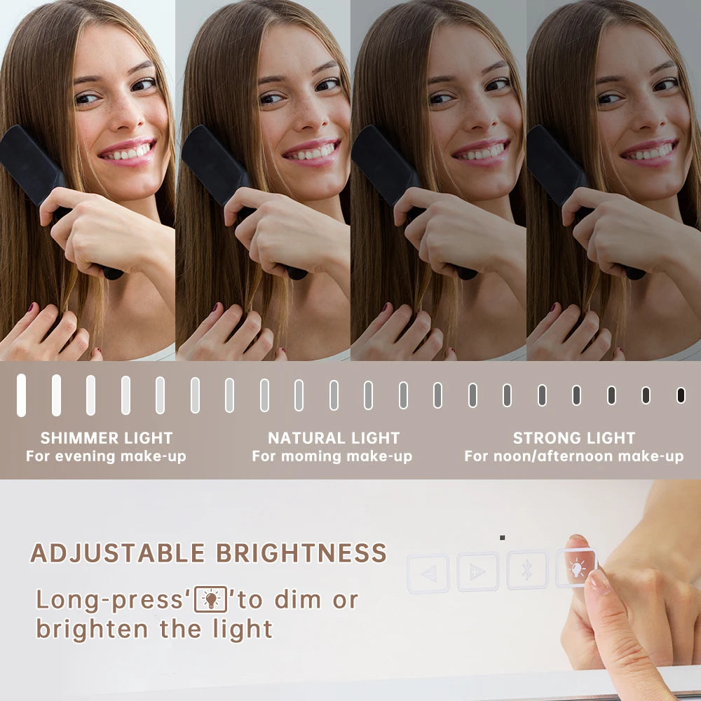 This vanity mirror with non-replace LED bulbs providing a large and bright viewing. Adjustable brightness and 3 lights colors (day light、cool white、warm yellow) helping you makeup. Memory mode makes the light return to the brightness as same as when you turned off.
