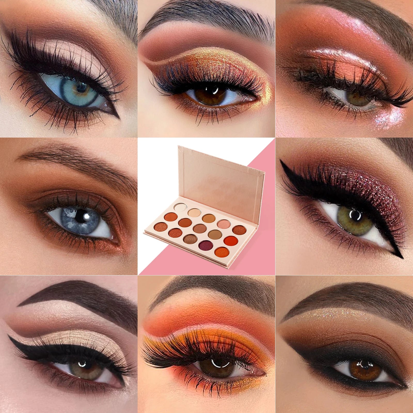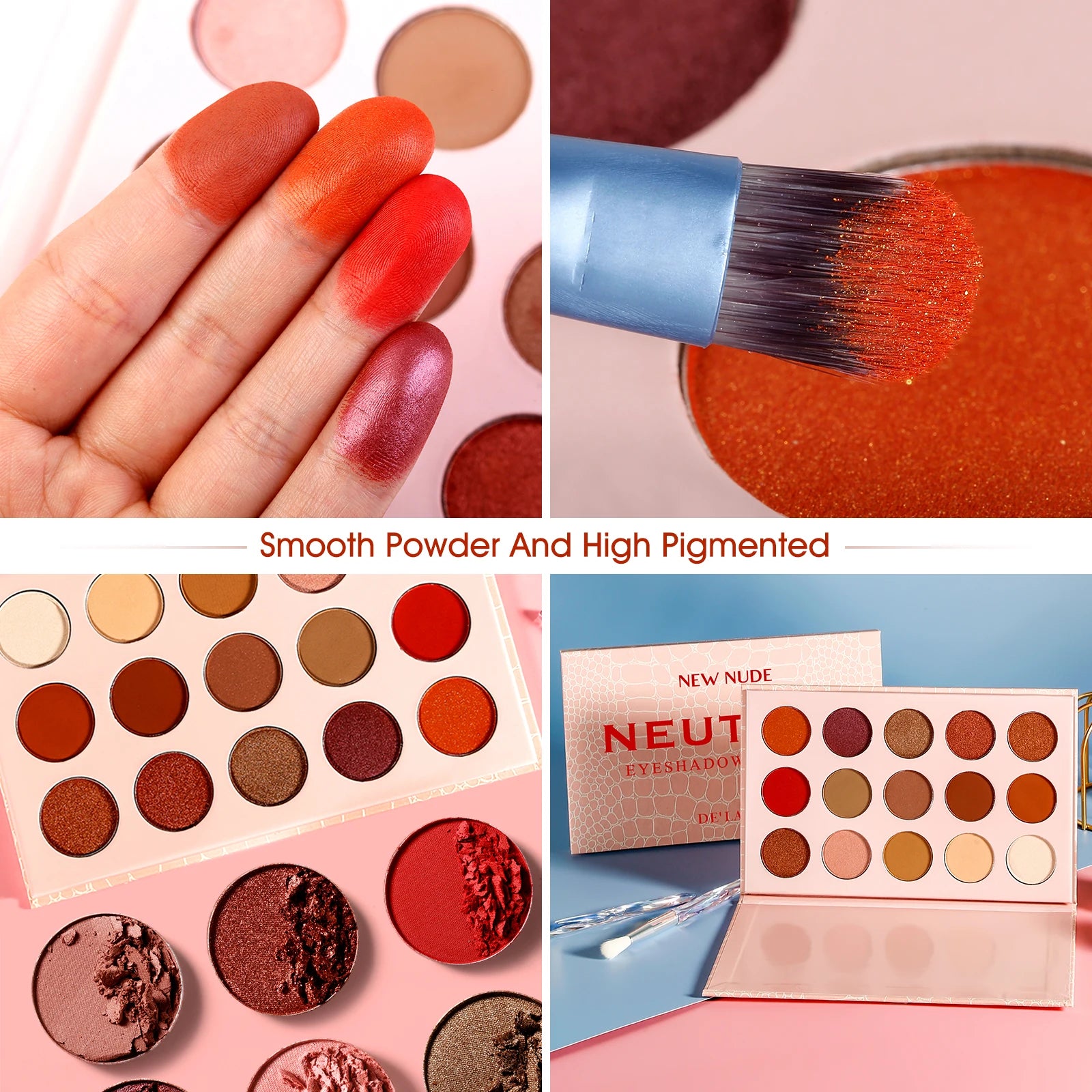 ------DE'LANCI Neutral makeup palette featuring 15 long-wearing eyeshadows ranging from rustic red, golden roses, berries and oranges to bronzed neutrals.