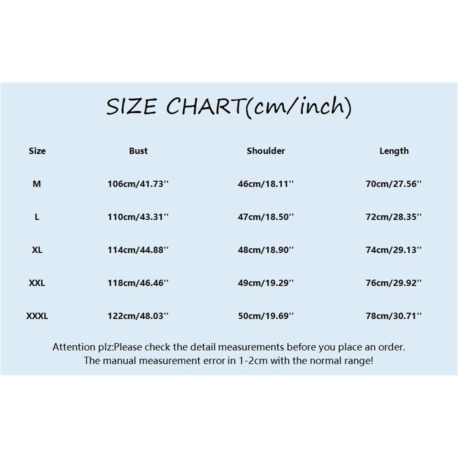 | Size:XXXL | Bust:122cm/48.03'' | Shoulder:50cm/19.69'' | Length:78cm/30.71'' |