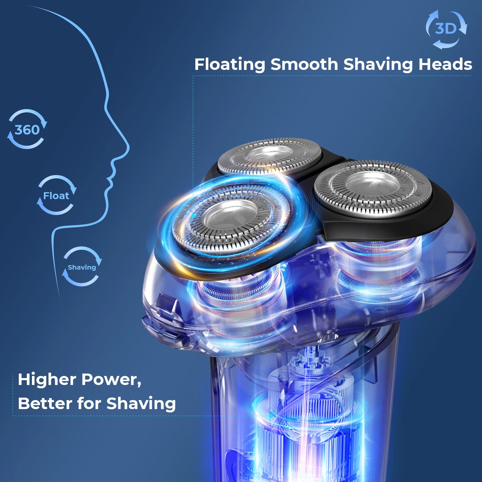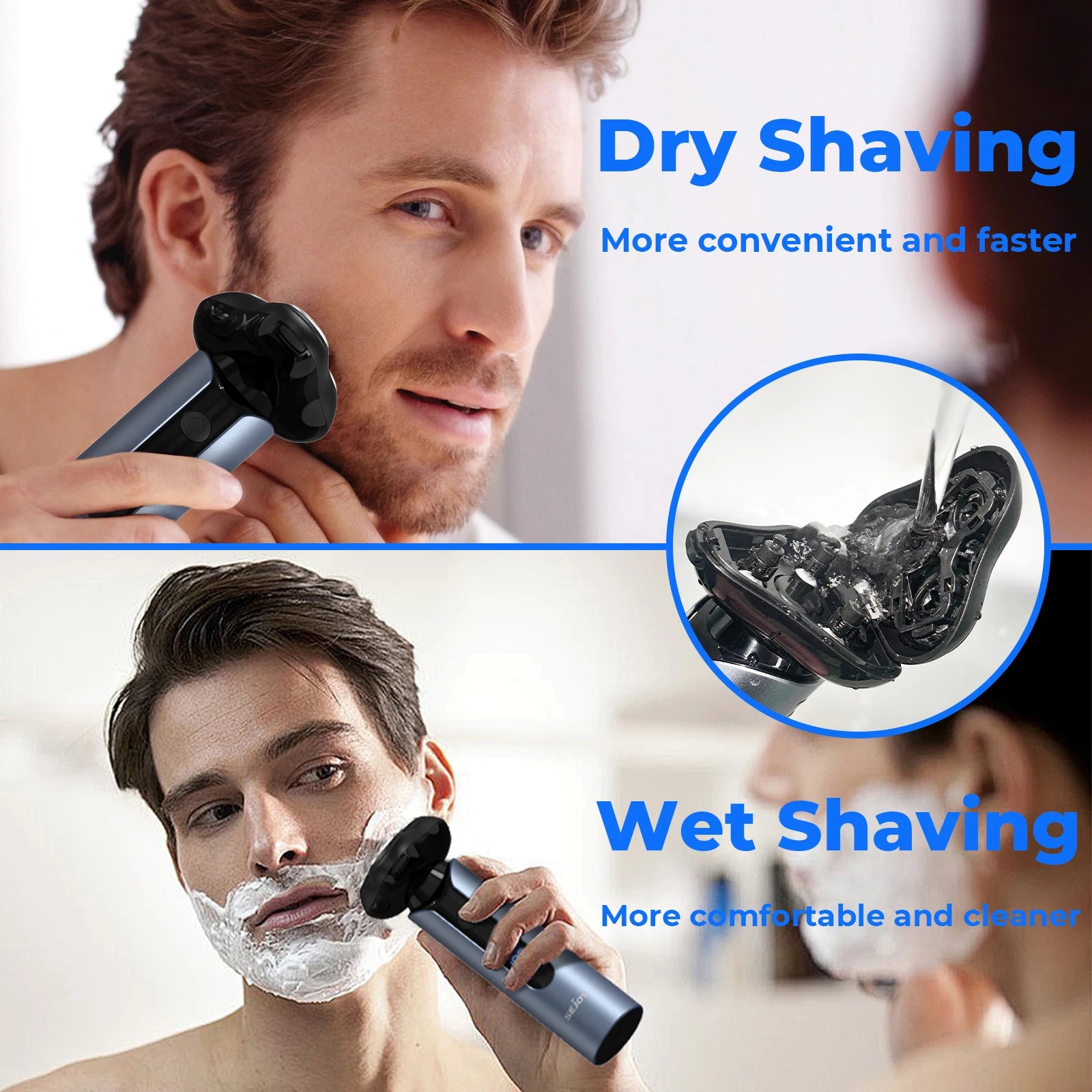 【3D Floating Shaving Head】-This electric razors for men is equipped with three 3D floating shaving heads which can perfectly follows the contours of your face, the neck and jaw line.It reduces skin friction and ensure smooth and gentle shaving.