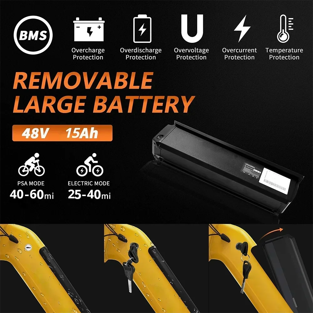 Battery capacity: 48V electronic display, 15AH, Yiwei 21700/5000 battery cell, 13S3P