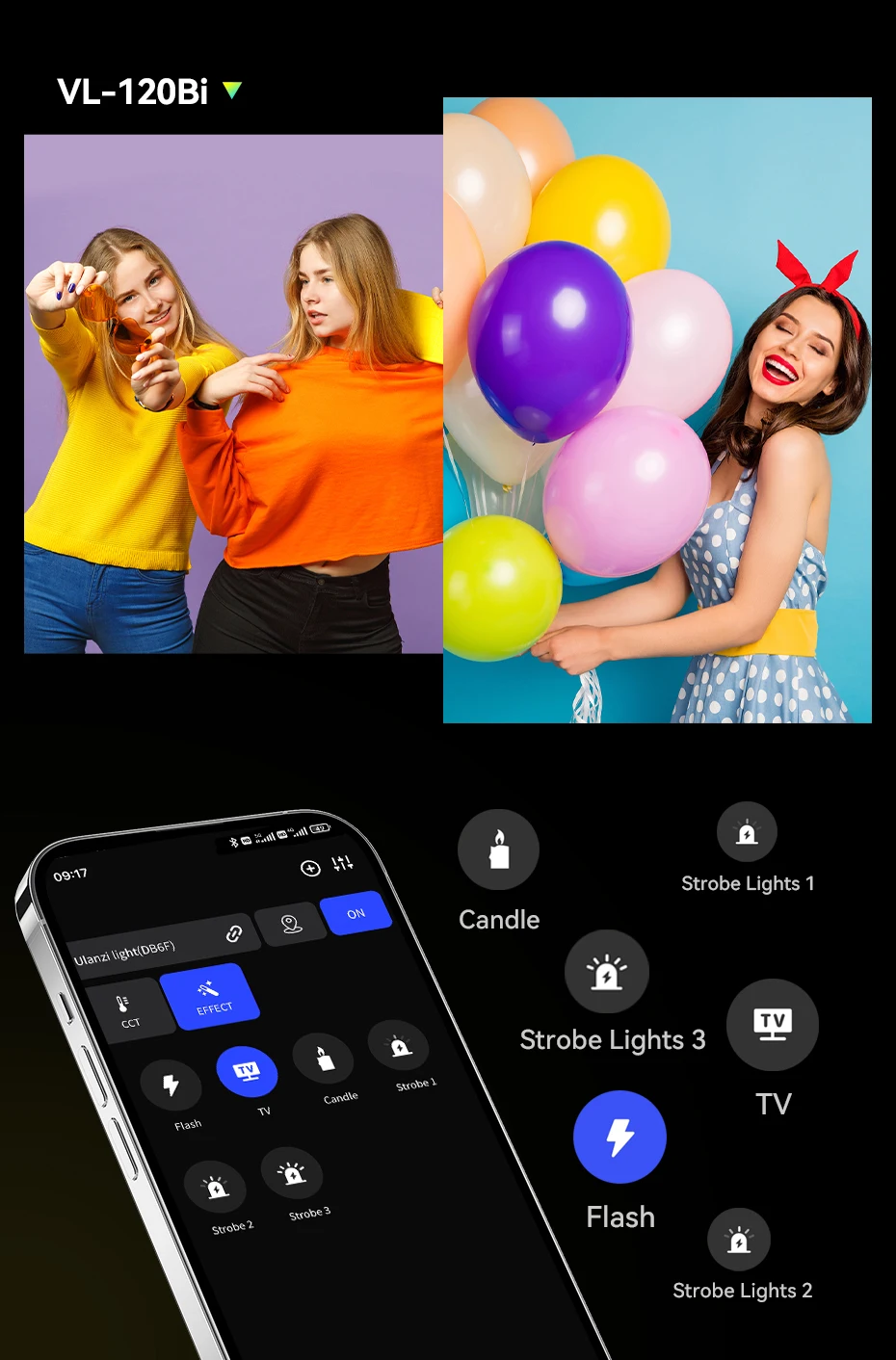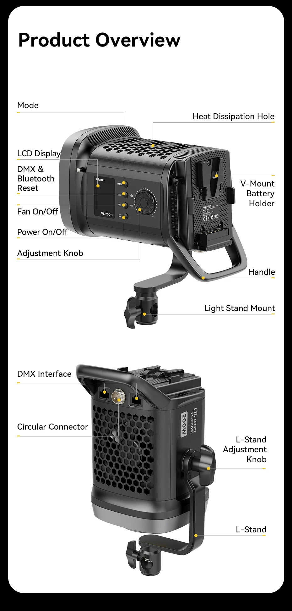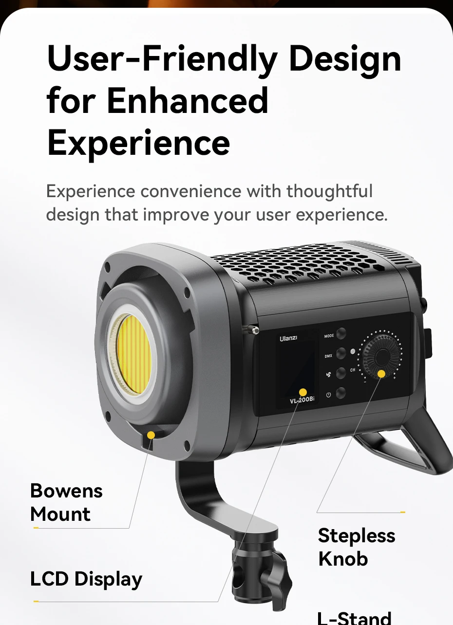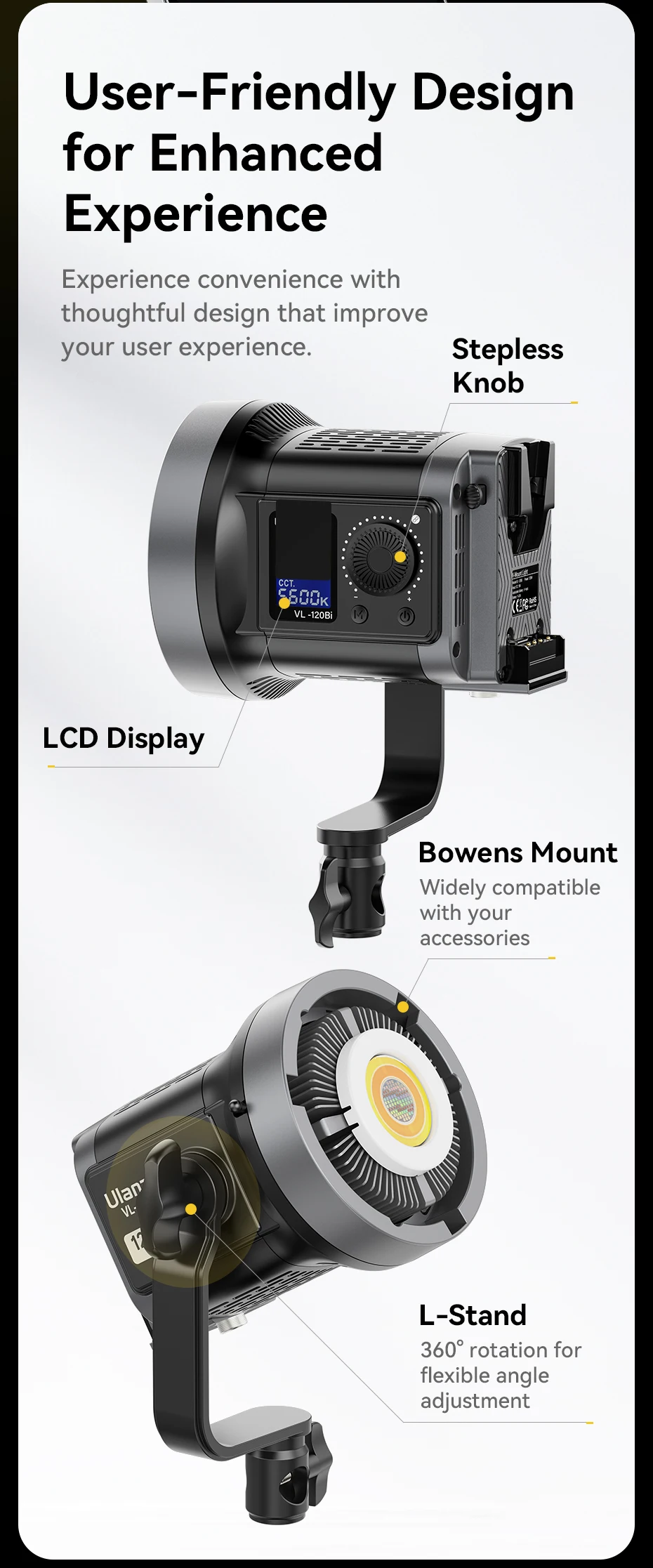 5. User-Friendly: LCD display, stepless knob, 360° L-stand, Bowens mount, and up to 30m remote control with Ulanzi Connect APP.