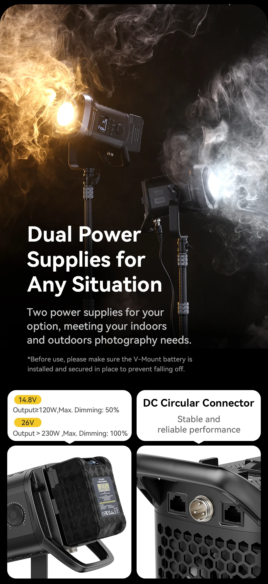 3. Dual Power Options: Use V-mount battery outdoors or DC adapter indoors (battery/adapter sold separately).