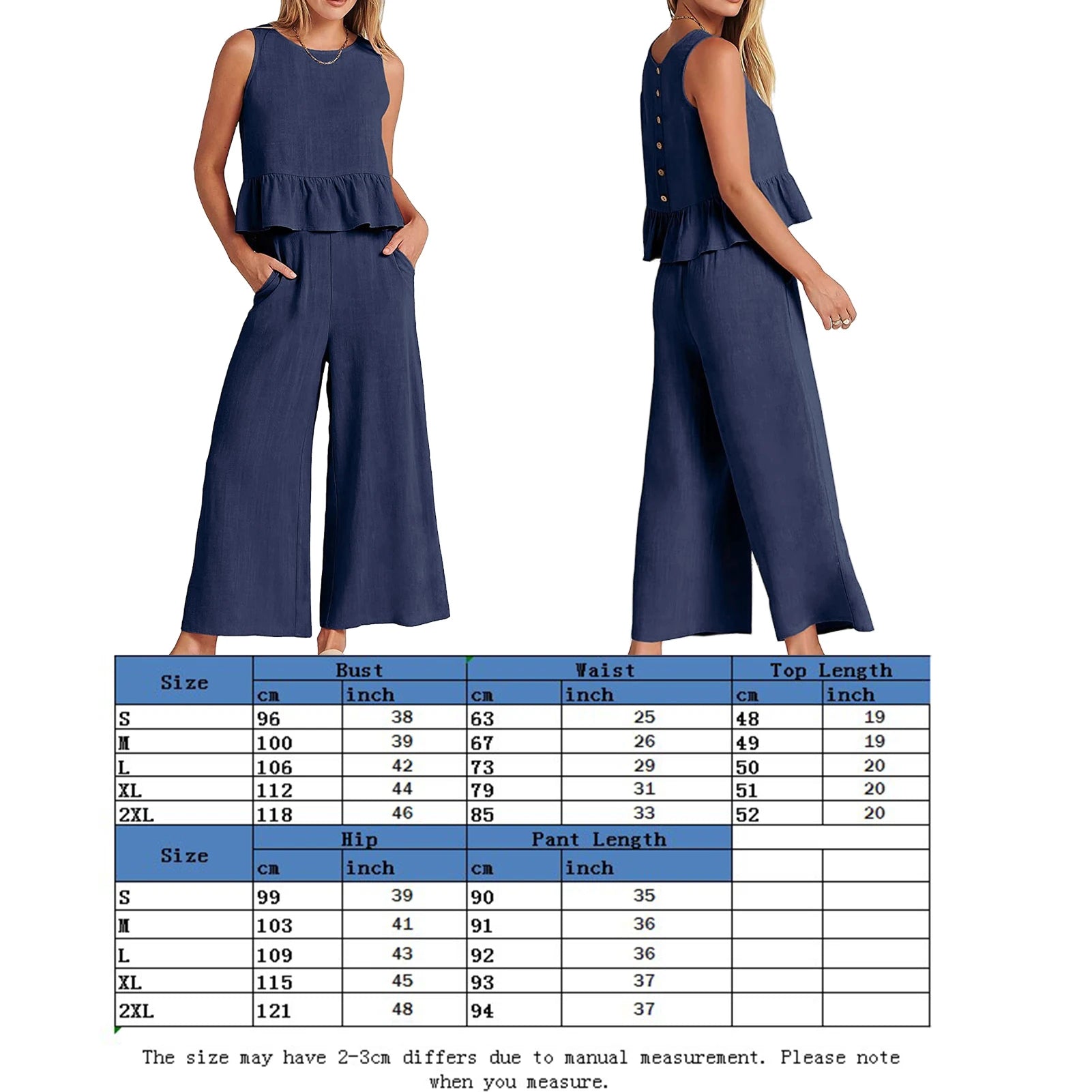 |   Cotton Summer 2 Piece Outfits Loose Fit Women 2 Pieces Pants Sets Square Neck Solid Color Sleeveless Vacation Outfit  Feature: 1. 100% Cotton Material: Made from 100% cotton material, this two-piece set is soft, lightweight, breathable, and perfect for summer wear. The natural cotton fibers also make it comfortable for all-day wear. 2. Machine Washable: Summer 2 piece outfits is machine washable, making it easy to clean and maintain its quality over time. 3. Versatile Outfit: Pleated lounge sets is suitable for various occasions such as summer parties, holidays, weddings, birthdays, family gatherings, casual outings, and more. It's perfect for anyone looking for a cute and comfortable outfit. 4. Cute Summer Style: Tank crop top pants features a sleeveless crop top with a square neckline and high-waisted wide-leg pants that reach the ankles. It's a cute and trendy look for any summer day. 5. Care Instructions: To maintain the quality of tank top long pants, hand wash it in cold water and avoid using a dryer to prevent shrinking. Hang or lay flat to dry. Specification: Elasticity: Slight Strech Item Type: Pant Suits Department: Women Sleeve: Sleeveless Clothing Length: Regular Pant Closure Type: Elastic Waist Closure Type: NONE Collar: Square Neck Material Composition: 100% Cotton Style: Casual Model Number: Summer 2 Piece Outfits Age: 18-24 Clothing Patterns: LOOSE Decoration: Folds Fabric Type: Blended Fit Type: Loose Fit Front Style: Pleated Release Date: Spring 2023 Length: Ankle-Length Pants Pant Style: Wide Leg Pants Pattern Type: Solid Season: All season Version: H-type Color: Dark Blue/Green/Lake Blue/Orange/Red(optional) Closing: insert Size: Small:---Pant Length (35)''---Waist (25)''---Top Length(19)''---Hip(38)''---Bust(36)'' Medium:---Pant Length (36)''---Waist (26)''---Top Length (19)''---Hip(40)''---Bust(38)'' Large:---Pant Length (36)''---Waist (29)''---Top Length (20)''---Hip(43)''---Bust(39)'' XL:---Pant Length (37)''---Waist (31)''---Top Length(20)''---Hip(45)''---Bust(41)'' XXL:---Pant Length (37)''---Waist (33)''---Top Length(20)''---Hip(49)''---Bust(43)'' Note: Due to the different monitor and light effect, the actual color of the item might be slightly different from the color showed on the pictures. Thank you! Please allow 1-2cm measuring deviation due to manual measurement.   1 x Pleated Lounge Sets