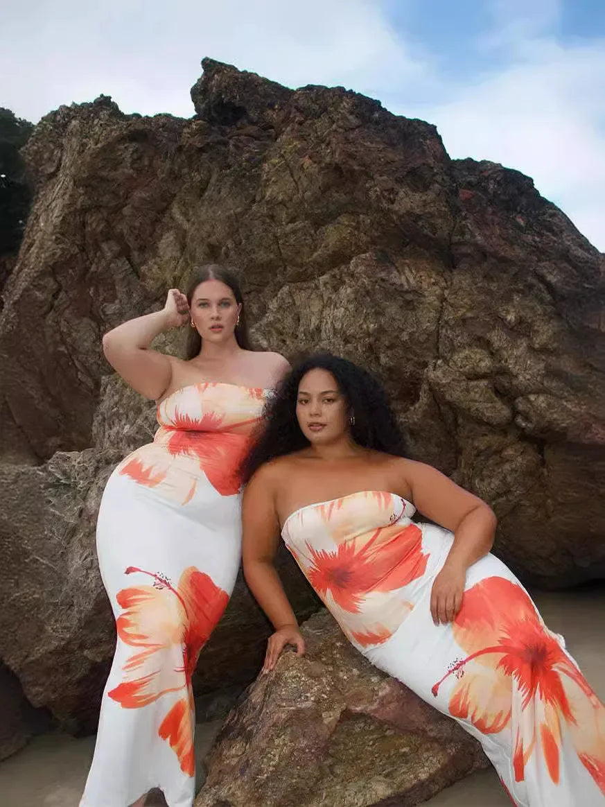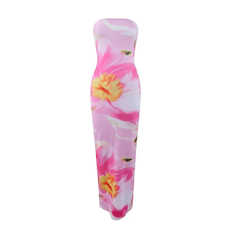 Women's Fashion Sexy Flower Print Strapless Long Dress .